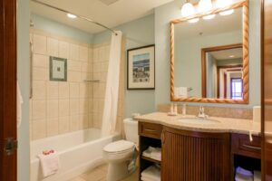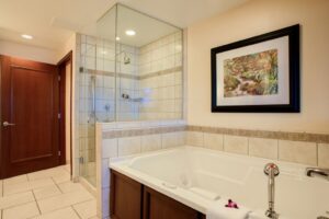 The primary bedroom is outfitted with Marriott’s signature “Halo” king size bed and the primary bath is equipped with an air bubble jacuzzi tub, glass shower, and separate vanities.. There is plenty of room for 8 guests at the dining room table and there are large flat panel TVs in all rooms.